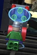 In the beginning of LEGO Batman 2: DC Super Heroes, Riddler is one of the numerous villains who raids The Man of the Year award ceremony, the others being Joker, Two-Face, Penguin, and Harley Quinn. When Batman and Robin arrive in the Bat-boat, he flees through the stage trapdoor with Joker, Riddler, and Penguin, only Harley stayed back to cover their flight. She was found and defeated by Batman and Robin.
